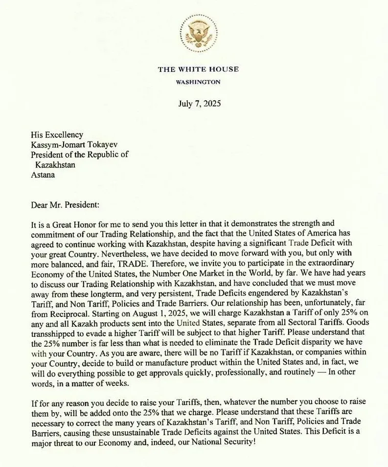 АҚШ президенті Дональд Трамп Қазақстан президенті Қасым-Жомарт Тоқаевқа 2025 жылғы 1 тамыздан бастап АҚШ Қазақстан тауарларына 25% мөлшерінде тарифтік баж салығын енгізуді жоспарлап отырғаны туралы хат жазды, деп хабарлайды Zakon.kz.