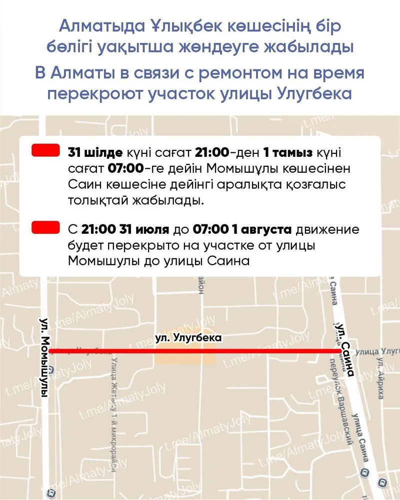 Атап айтсақ, 31 шілде күні сағат 21:00-ден 1 тамыз күні сағат 07:00-ге дейін Момышұлы көшесінен Саин көшесіне дейінгі аралықта қозғалыс толықтай жабылады.