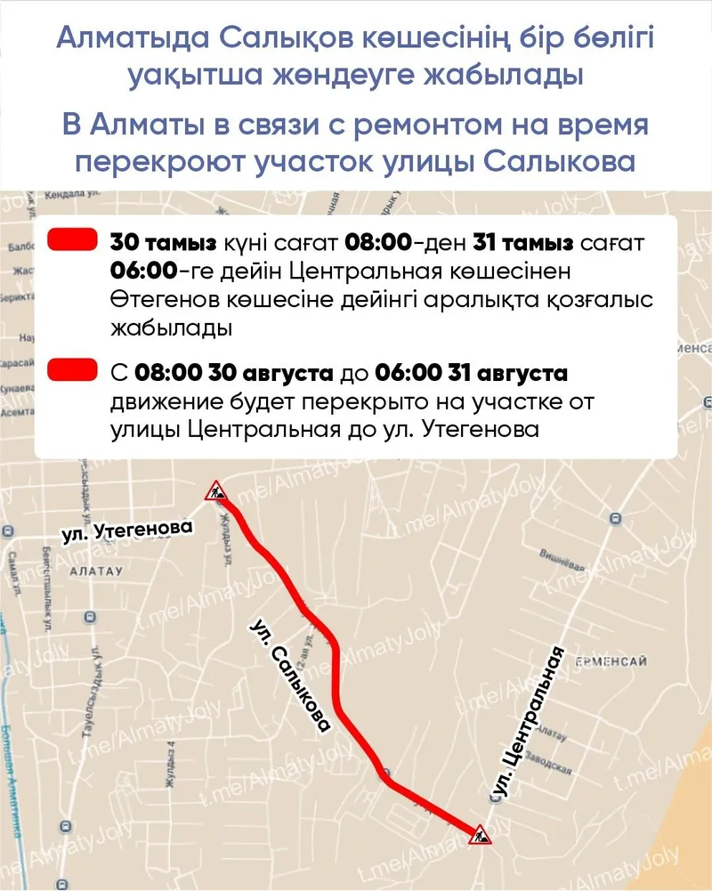 Сонымен қатар қозғалысқа шектеу қою жөніндегі толық ақпарат @AlmatyJoly Telegram арнасында, әкімдіктің әлеуметтік желілерінде және 2GIS және "Яндекс карталарында" жарияланған.