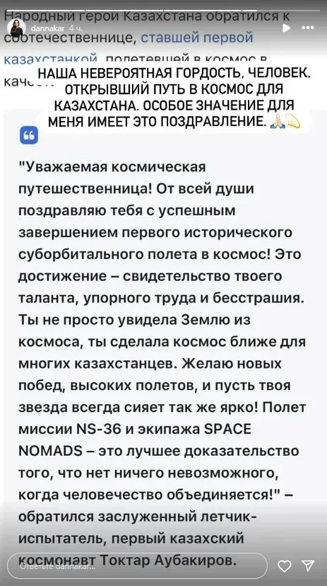 "Еліміздің мақтанышы, Қазақстан үшін ғарышқа жол ашқан ерекше жан. Сіздің бұл құттықтауыңыздың мен үшін маңызы зор", – деп жазды ол 2025 жылғы 15 қазанда Instagram-Stories парақшасында.