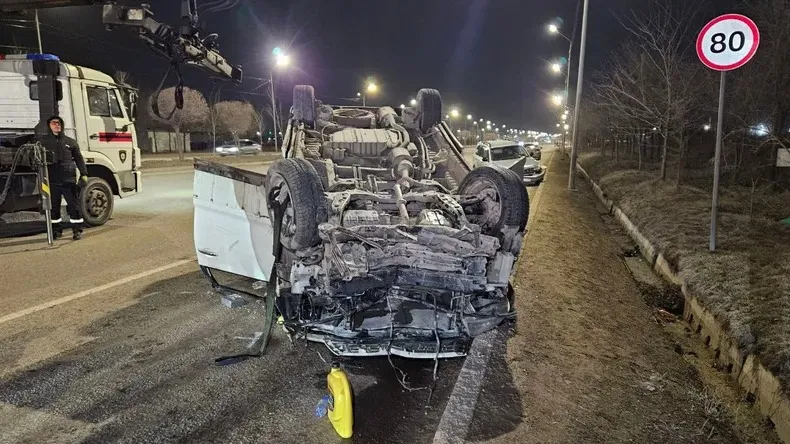 Toyota жол айырықтағы бөлгішке соғылып, аударылып кеткен. Көлік төңкерілген күйде біраз жерге дейін сырғып барып, жол жиегіне тоқтаған.