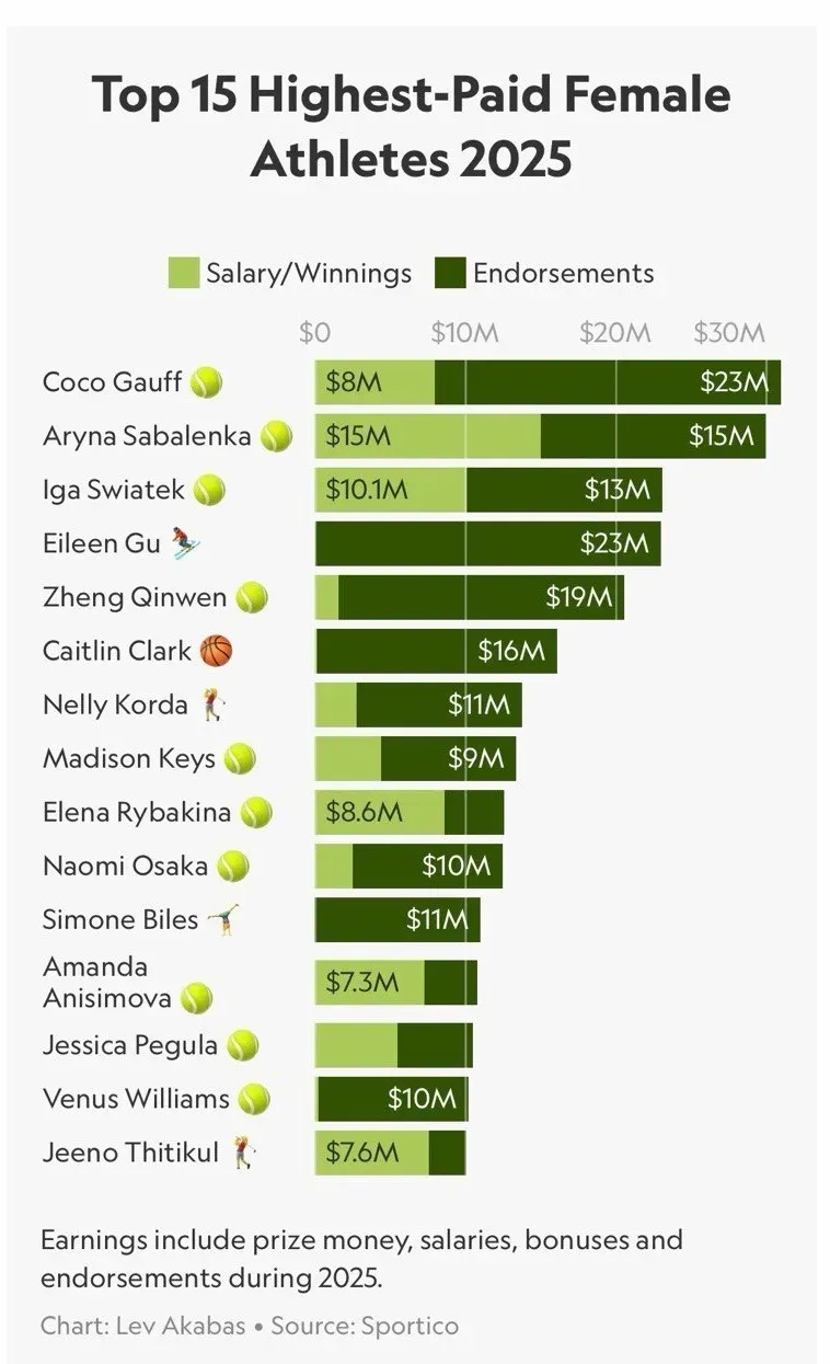 Sportico дерегіне сүйенсек, "Үлкен шлем" турнирлерінің екі дүркін чемпионы, әлемнің үшінші ракеткасы, АҚШ теннисшісі Корри Гауфф 2025 жылы ең көп табыс тапқан спортшы атанды. Ол бір жылда 31 млн доллар тапқан, оның 23 млн доллары – демеушілік келісімшарттардан.