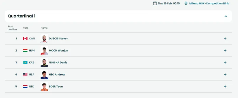 Барлығы 4 топ. Айта кетейік, жартылай финалға әр топтан 1-2-орын алған шорт-трек шебері тікелей жолдама алады. Сонымен қатар кейін мәреге 3-болып жеткен 2 спортшы үздік уақыт көрсеткіші бойынша 1/2 финалға өтеді.
