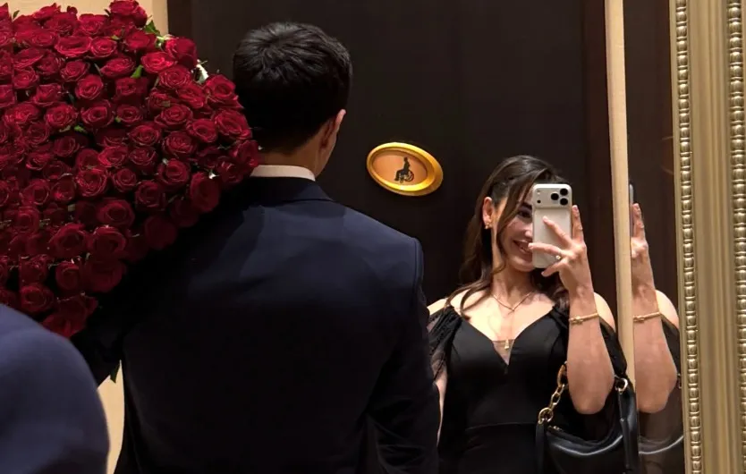 Спортшы қалыңдық жүзігін және әдемі қызыл раушан гүлдерінің букетін көрсетті.